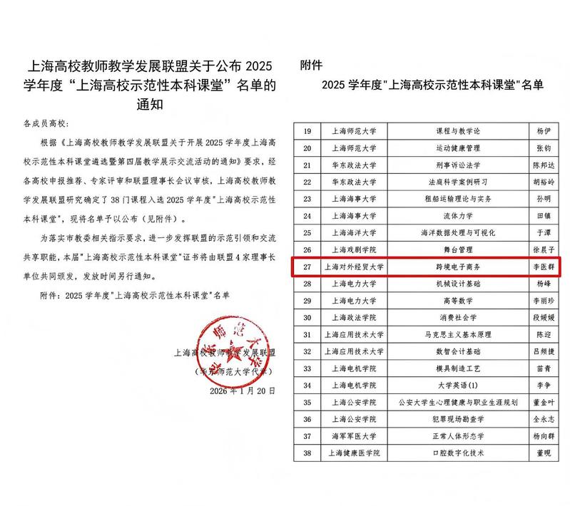近日,上海高校教师教学发展联盟发布了《上海高校教师教学发展联盟关于公布2025学年度“上海高校示范性本科课堂”名单的通知》,我校申报的“跨境电子商务”课程获批2025学年度“上海高校示范性本科课堂”。