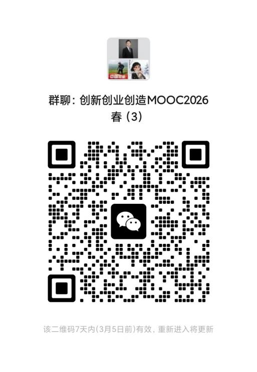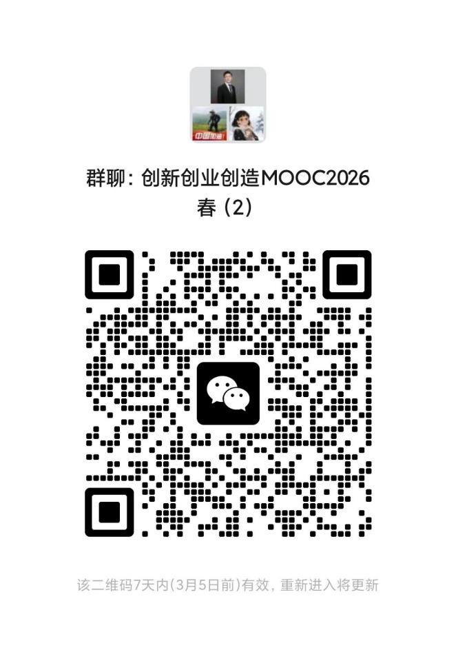 已在校内选课的同学,登录平台后会自动跳出该课程,请确认并修读“共享课”,同时请扫码加入课程微信群,方便随时沟通。(群名称:创新创业创造MOOC2026春(1),群名称:创新创业创造MOOC2026春(2),创新创业创造MOOC2026春(3)加入其中一个群即可,勿重复加群。)