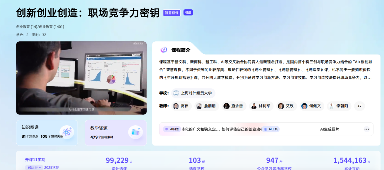 本课程首批入选教育部国家高等教育智慧教育平台,获评2022年度上海高校一流本科课程(优质在线类)、全国2015-2020深化高校创新创业教育改革优秀课程奖、荣获智慧树平台2023秋冬学期【人气课】、荣获智慧树平台2024秋冬学期精品课,入选高校在线开放课程联盟联席会“慕课十年典型案例”,入驻教育部跨学科课程教学创新改革虚拟教研室特色课程,并作为上海对外经贸大学在智慧树平台上开设的“创新创业创造+融合教育”在线微专业(入选教育部首批高校学生就业能力提升“双千”计划备案)核心课之一。课程自上线以来,校内外修读人数超14万人,山东大学(威海)、北京科技大学、江苏科技大学等多所高校将该课程纳入共享选课,同时吸引到教师、工程师、主医师等社会学员学习。课程基于新文科、新商科、新工科等交叉融合协同育人最新理念打造,是国内首个将三创与职场竞争力结合的就创融合课程,不同于传统的比较深奥、理论性较强的《创业管理》、《创新管理》、《创造学》课,也不同于一般知识传授的《生涯规划指导》课,共分四大教学模块,分别为通过学习创新方法、学习创业技能、学习创造技法提升职场竞争力,以及大学生“三创”技能融合与人生设计。课程团队由国内外三创和生涯教育专家、来伊份集团董事长施永雷、英诺天使基金合伙人付利军等知名实务专家参与录制。同名配套教材荣获全国深化高校创新创业教育改革优秀教材奖。本学期正式升级上线AI智慧课程。